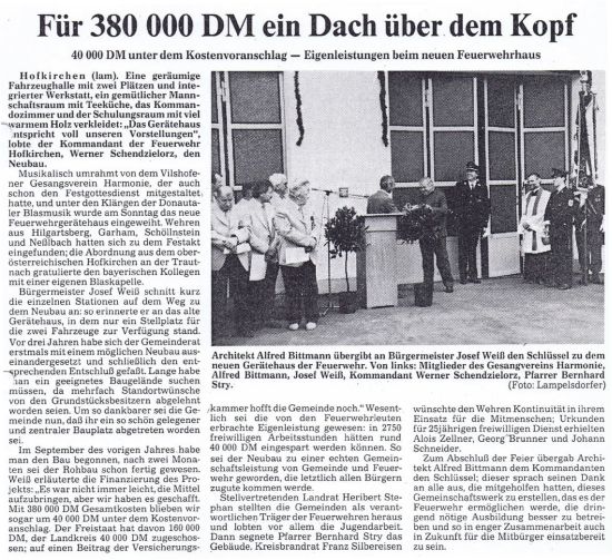 Im Sommer 1986 wurde mit den Bauarbeiten für das neue Feuerwehrgerätehaus in der Hans-Carossa-Straße begonnen. Die Wehrmänner waren entsprechend fl eißig und legten durchwegs selbst Hand an beim Bau. Nach etwas über einjähriger Bauzeit wurde das neue Feuerwehrhaus im Oktober 1987 feierlich eingeweiht und der Feuerwehr standen nun neben zwei Stellplätzen Räumlichkeiten für die Mannschaft, ein Unterrichtsraum, sowie ausreichend sanitäre Anlagen zur Verfügung.