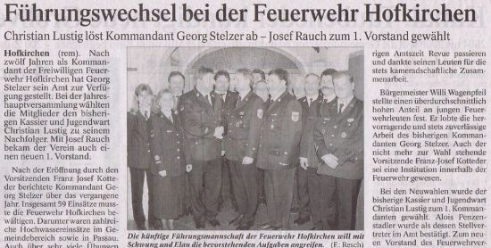 2001 Anlässlich des 25-jährigen Bestehens der Partnerschaft mit Hofkirchen an der Trattnach fi nden die Feierlichkeiten am 22. September bei uns in Hofkirchen statt. Kommandant Georg Stelzer wird zum Kreisbrandmeister 4.3 im KBI-Bereich Nord bestellt.