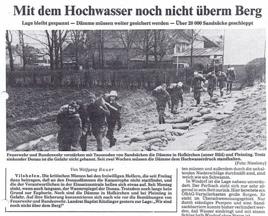 Katastrophenalarm in den Donaugemeinden. Im Jahre 1988 ist Hofkirchen von einem der größten Hochwasser heimgesucht worden, dem Größten nach 1954. Die Freiwillige Feuerwehr Hofkirchen war tagelang unermüdlich für das Wohl der Gemeinschaft im Einsatz. Nachfolgende Presseberichte lassen die Geschichte eindrucksvoll Revue passieren.